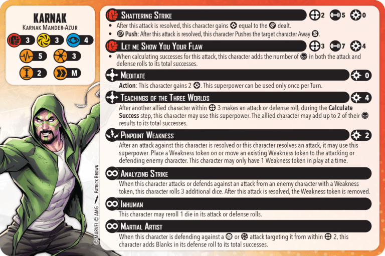 Karnak is an Inhuman, so gets the default reroll, very nice. He is also a Martial Artist, letting him count Blanks when defending Physical or Energy attacks within range 2. This goes well with high Mystic defence to give solid coverage. He is sadly NOT Immune to Poison.