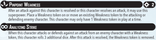 Analyzing Strike is the second part of this superpower combo. When an opponent with a Weakness token attacks or is attacked by Karnak, Karnak adds 3 dice to his roll, and then removes the token.