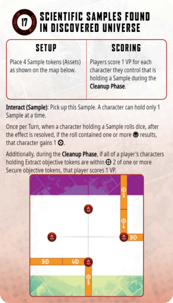 Scientific Samples is a D Shape crises with 4 Asset extracts and 1 extra VP available. Holding an Extract (can hold 1 max) allows the character to gain 1 Power when they roll a failure, once per turn.