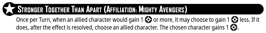 The Mighty Avengers leadership can be used once per turn when an affiliated character would gain power.